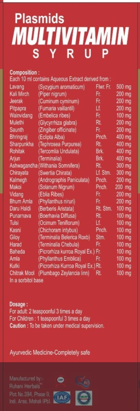 Plasmids Multivitamin Syrup is an Ayurvedic formulation typically designed to support general health and well-being by providing essential vitamins and minerals. In Ayurvedic medicine, such syrups might also contain herbal extracts that help in balancing the body’s doshas (Vata, Pitta, and Kapha) and improving overall vitality.